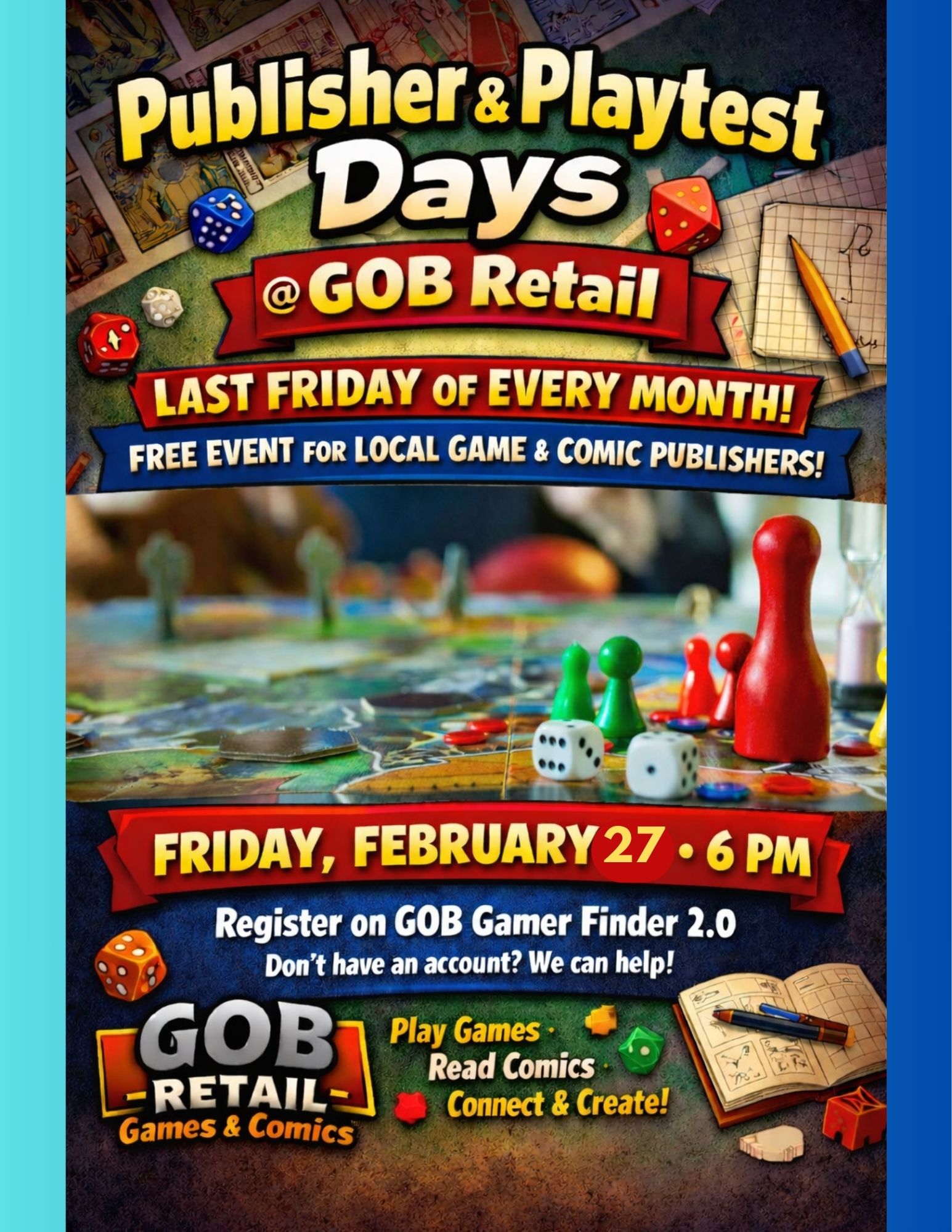 | Event Details: | FREE monthly event held on the last Friday of every month for local game & comic publishers, designers, and aspiring creators. This event is designed to bring together creators who are: Working on games or comics currently in development Looking for playtesters and feedback Interested in networking with other local designers & publishers Curious about getting started in publishing (no experience required) 🧩 What to Expect: Playtest your tabletop, card, RPG, or board game projects Get feedback from players and fellow creators Network and talk shop with other local publishers & designers Learn how to list public playtest events using GOB Gamer Finder 2.0 📅 Event Date: 4th Friday of each month. This month Friday, February 27 ⏰ Start Time: 6:00 PM 📍 Location: GOB Retail 💲 Cost: FREE Friday nights also overlap with GOB’s open family board gaming night, giving creators the opportunity to reach a broader audience of potential playtesters. 👥 Who Should Attend: Game designers (published or unpublished) Comic creators & small publishers Aspiring designers exploring publishing Local creators looking to connect with the community 👉 Registration is encouraged to reserve your spot, but walk-ins are welcome. If you don’t have a GOB account, staff can help you set one up in-store. 📦 Publishers with in-print products are welcome to bring samples. 🔔IMPORTANT: This event repeats MONTHLY on the LAST FRIDAY of each month in the GOB Game Room. Once you attend, you're welcome to come back every month! If you’d like to invite players to playtest your own games or projects (games, comics, books, and more), please create a post and share details about what you’re working on. 👉 Create a Playtest post on GOB Gamer Finder 2.0 here: http://gobretail.com/gamerfinder/gamerfinder-v2.php Looking forward to the next round of playtesting! See you at GOB. ![]() |