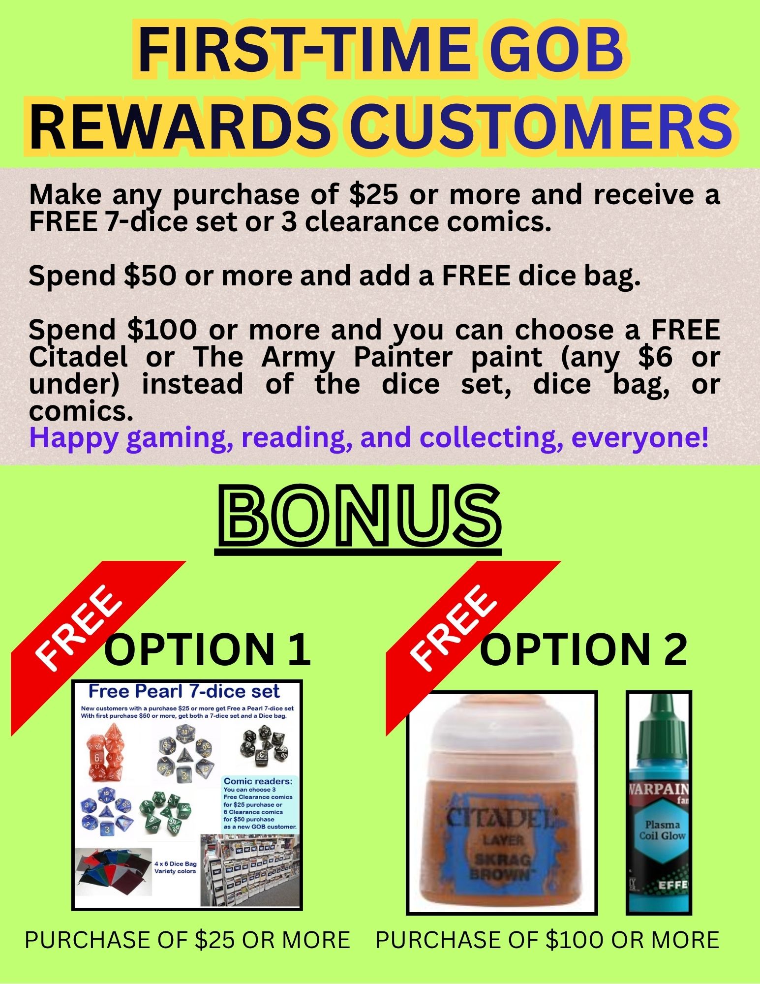 Spend $100 or more and you can choose a FREE Citadel or The Army Painter paint (any $6 or under) instead of the dice set, dice bag, or comics.
