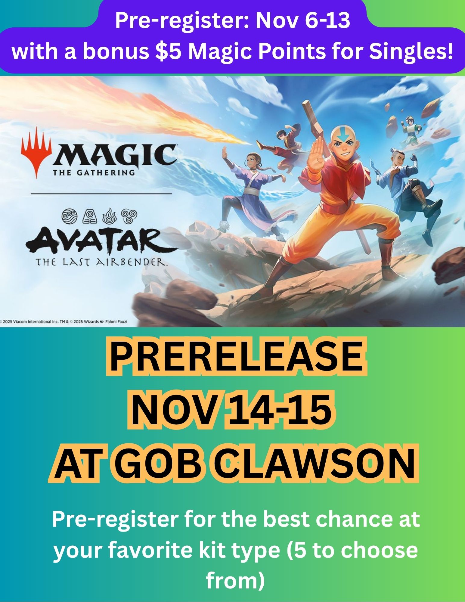 - Avatar MTG Prerelease: Now open for pre-registration! Pre-register to the best chance to choose your favorite kit (5 types available) and earn a $5 Magic Points bonus when you pre-register by Nov 13.