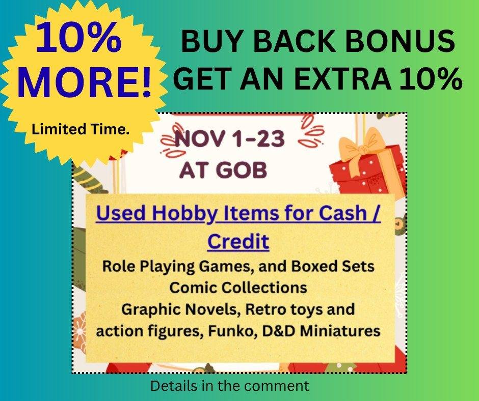 Bring in your used RPGs, comic long boxes, graphic novels, retro action figures, and D&D miniatures — get a BONUS 10% MORE in cash or store credit!