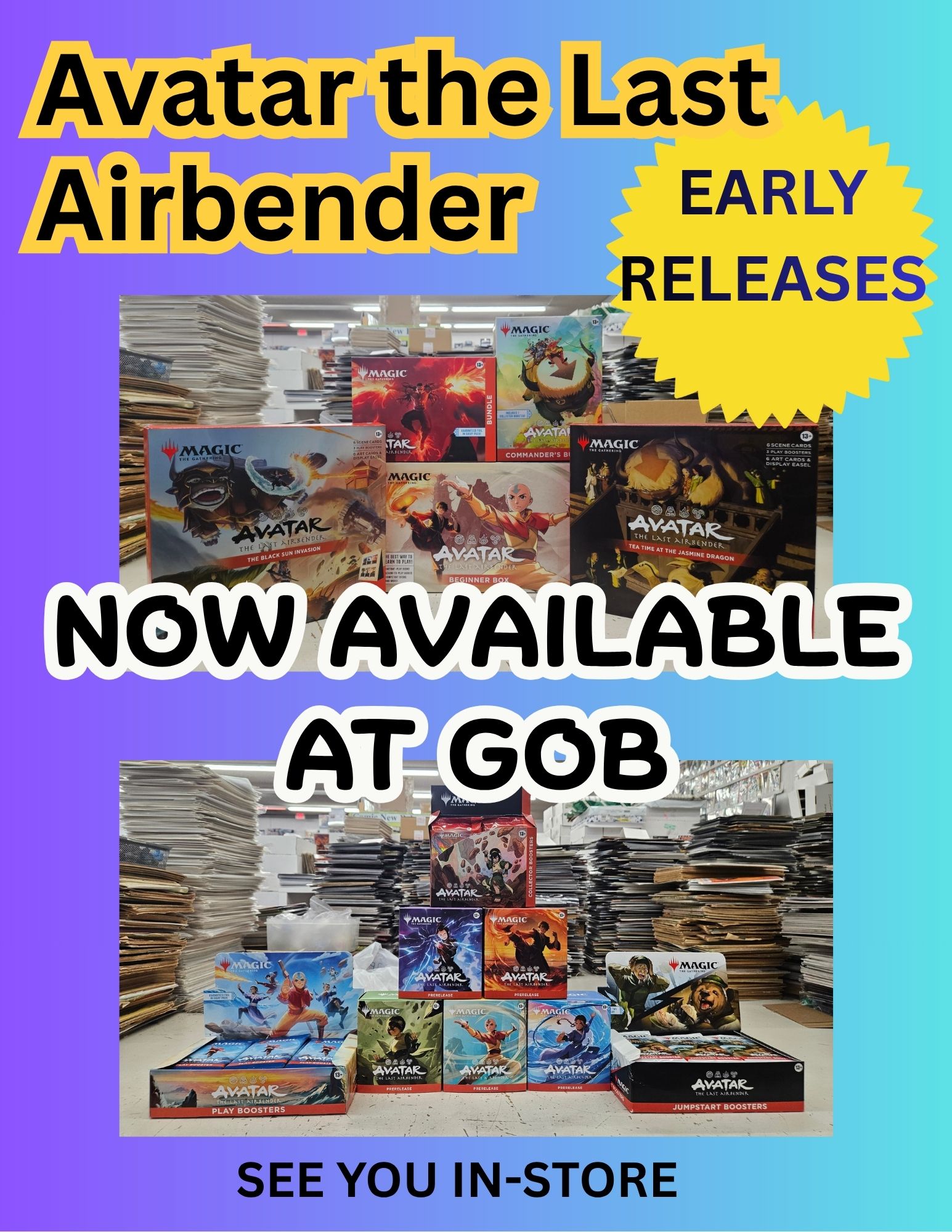 Your Avatar set is here at GOB! Prerelease events and full set products will be in stock and available for sale in-store starting this Friday.