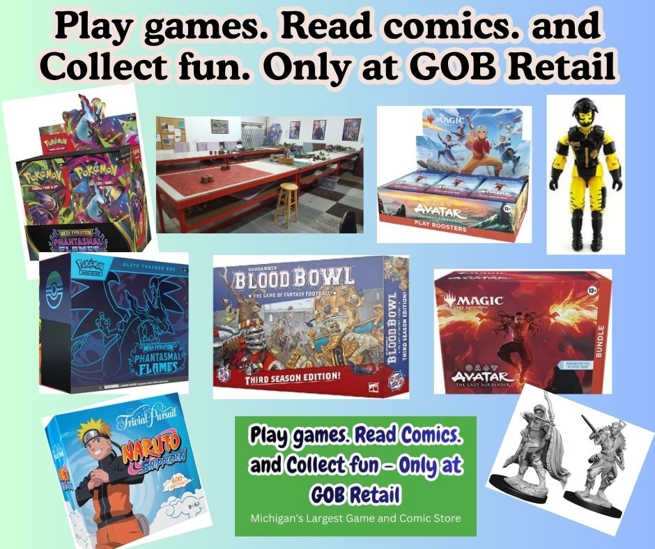 Play games. Read comics. Collect fun. Only at GOB Retail – Michigan’s largest game and comic store.