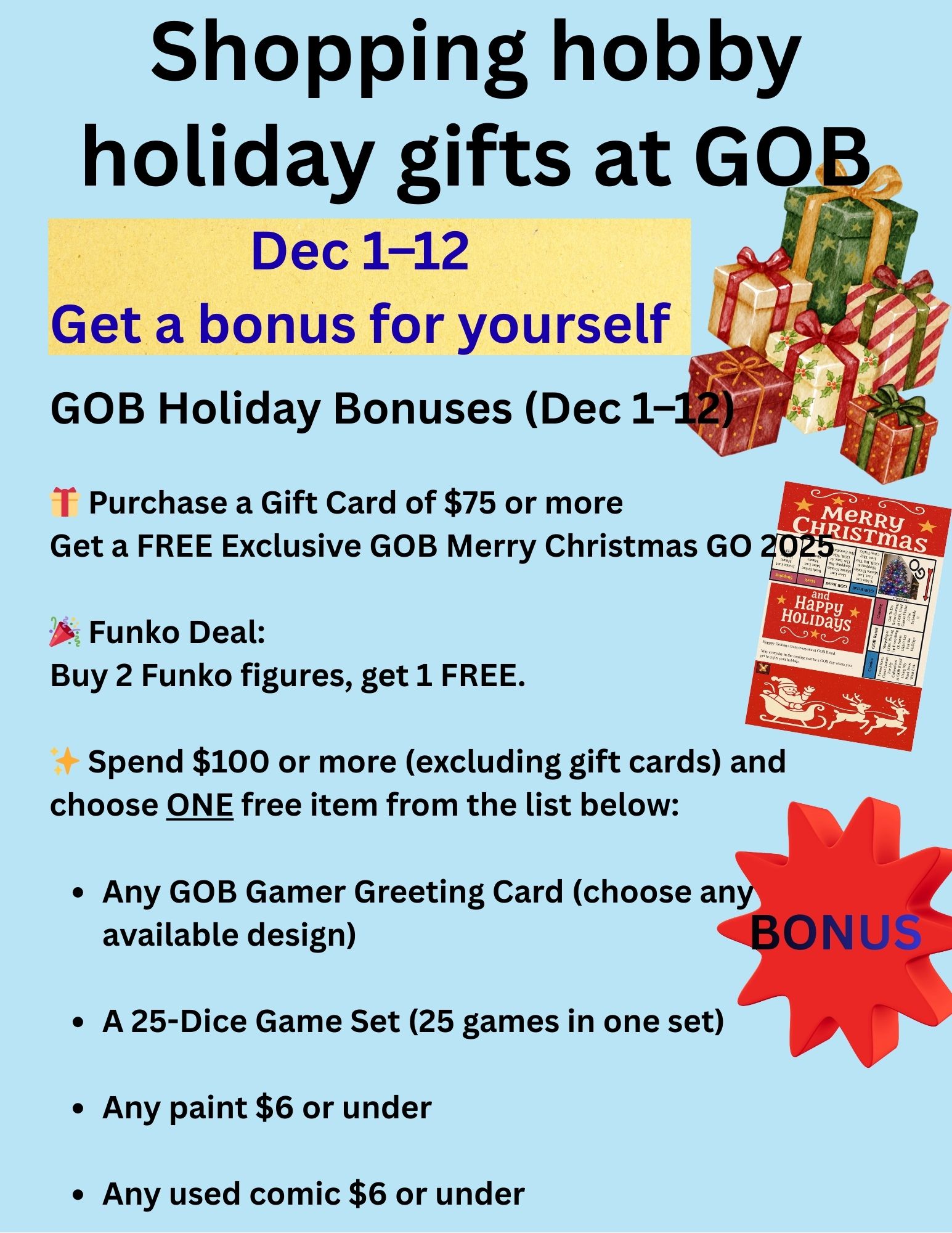 Shopping hobby holiday gifts at GOB. Dec 1–12 Get a bonus for yourself!
