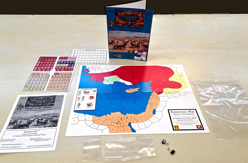 Ramesses' War is an easy to play two to four player game that lets you revisit that ancient conflict. However, the map provided expands the conflict to also encompass the various regional powers. Troy, an ally of the Hittites, plus Lukka, the Mittani and Ahhiyawa (Most probably the Hittite name for the Mycenaean Greeks), as well as providing units for an Arzawan rebellion and troops for each Palestinian city state.